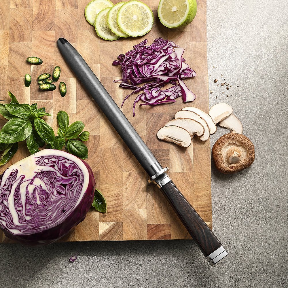 Reach for this before you reach for the whetstone. A honing rod doesn't remove steel; it realigns the edge that's folded over from ordinary use. Five or six passes before a prep session and your Ji Series knife cuts the way it did the week you bought it.